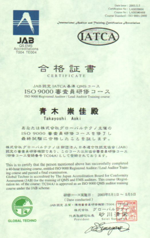 | ISO9001審査員の試験に合格しました 審査員登録の申請をしましたが ,書類のだしなおしだってさっ 続けて14001のほうも取ろうと思っています 医療分野の審査員はほとんどいないから ISO9001/14001の認証取得を考慮中の方はぜひ声をかけてください, 良心的な見積りいたします。詳しい説明に伺います。 最近全国の歯科医院のISO9001の審査に出かけることが多くなりました。(H.17.から) |